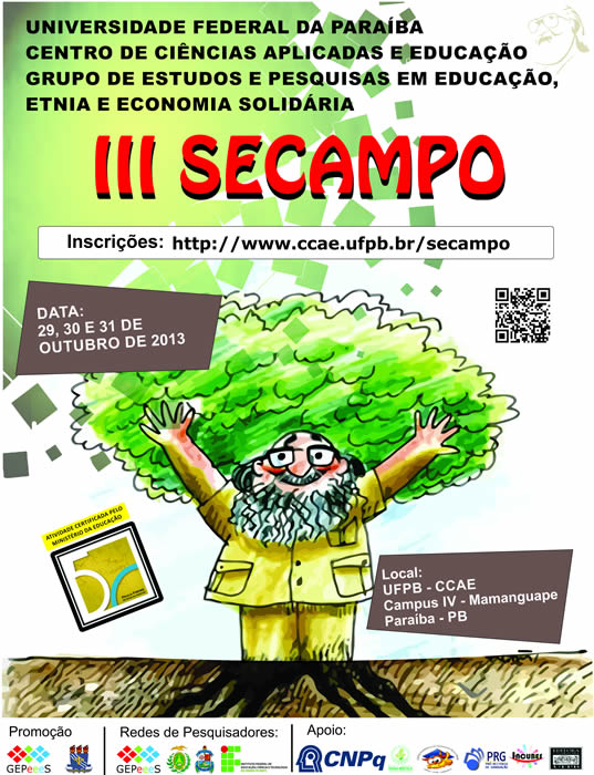 Será realizado entre os dias 29 e 31 de outubro, na unidade de Mamanguape do campus IV da UFPB, o 3º Seminário de Práticas de Educação do Campo (3º Secampo). Com a temática “Educação, cultura e diversidade”, o evento tem como objetivo fortalecer o campo educacional. Os interessados em participar podem submeter trabalhos até a próxima quinta-feira (26/9), pelo site http://www.ccae.ufpb.br/secampo.