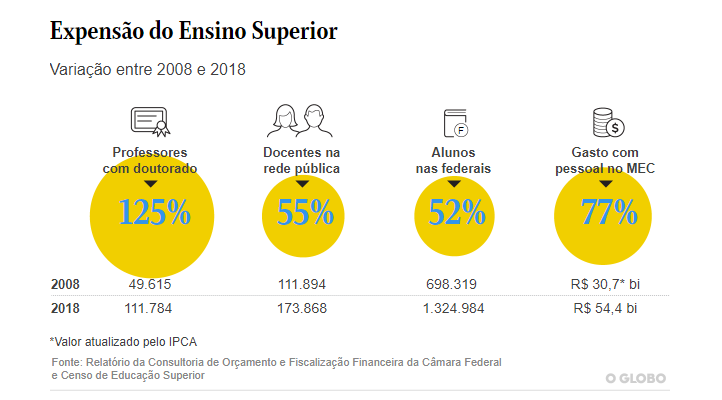 Nos últimos dez anos, o Brasil viveu uma expansão do ensino superior aliada à qualificação dos docentes, e a combinação desses fatores acarretou em um aumento de 77% da folha de pagamento de pessoal do MEC.