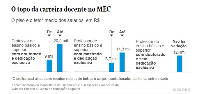 A remuneração média de um professor federal, ligado ao Ministério da Educação, foi de R$ 11.109 em junho de 2018, de acordo com os dados do Ministério da Economia. Nesse mesmo mês, as carreiras jurídicas do Poder Executivo federal receberam, em média, R$ 24.025 — mais alta remuneração média entre as categorias que mais pesam no Orçamento da União.